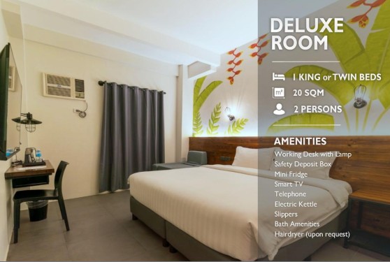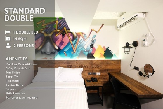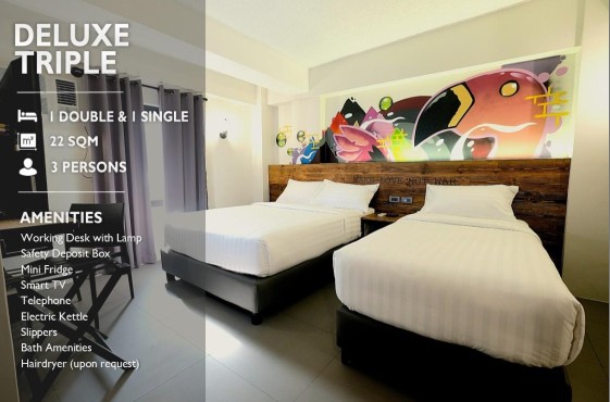 Step into a one-of-a-kind stay where comfort meets creativity. Each Artsy Room is designed to be more than just a place to rest—it’s a canvas of inspiration. Featuring contemporary interiors highlighted by hand-painted murals from talented local artists, these rooms reflect the vibrant culture and artistry of Makati. Blending style and function, every room comes with plush bedding, smart amenities, and thoughtful touches that make your stay cozy yet unforgettable. Whether you’re here for business or leisure, the Artsy Rooms invite you to relax, recharge, and be surrounded by a space that’s as unique as you are.